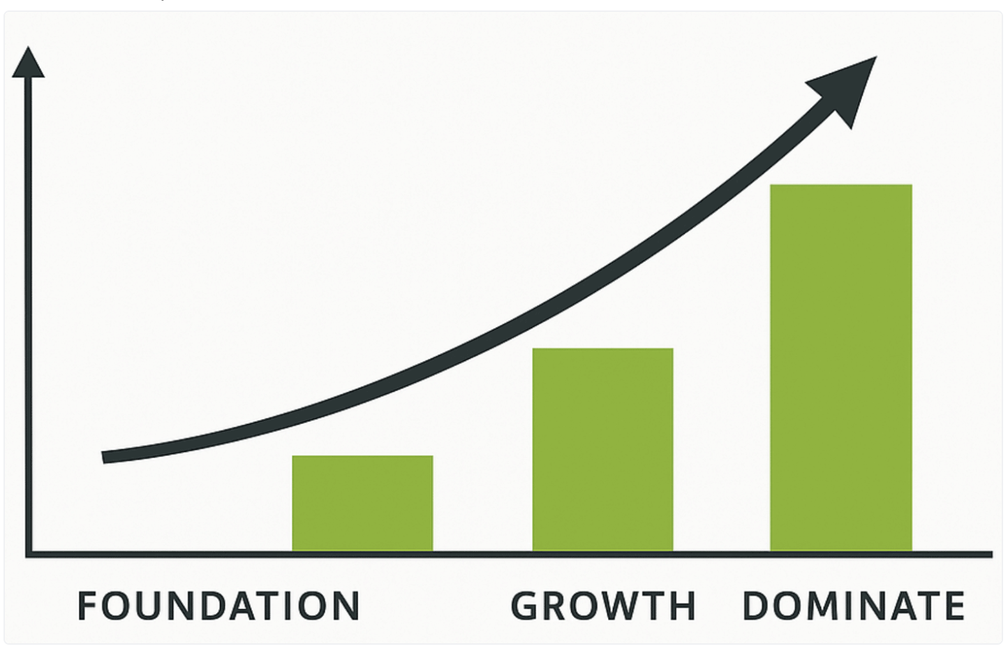 - Dominate → Full-funnel strategy, advanced retargeting, and high-leverage content