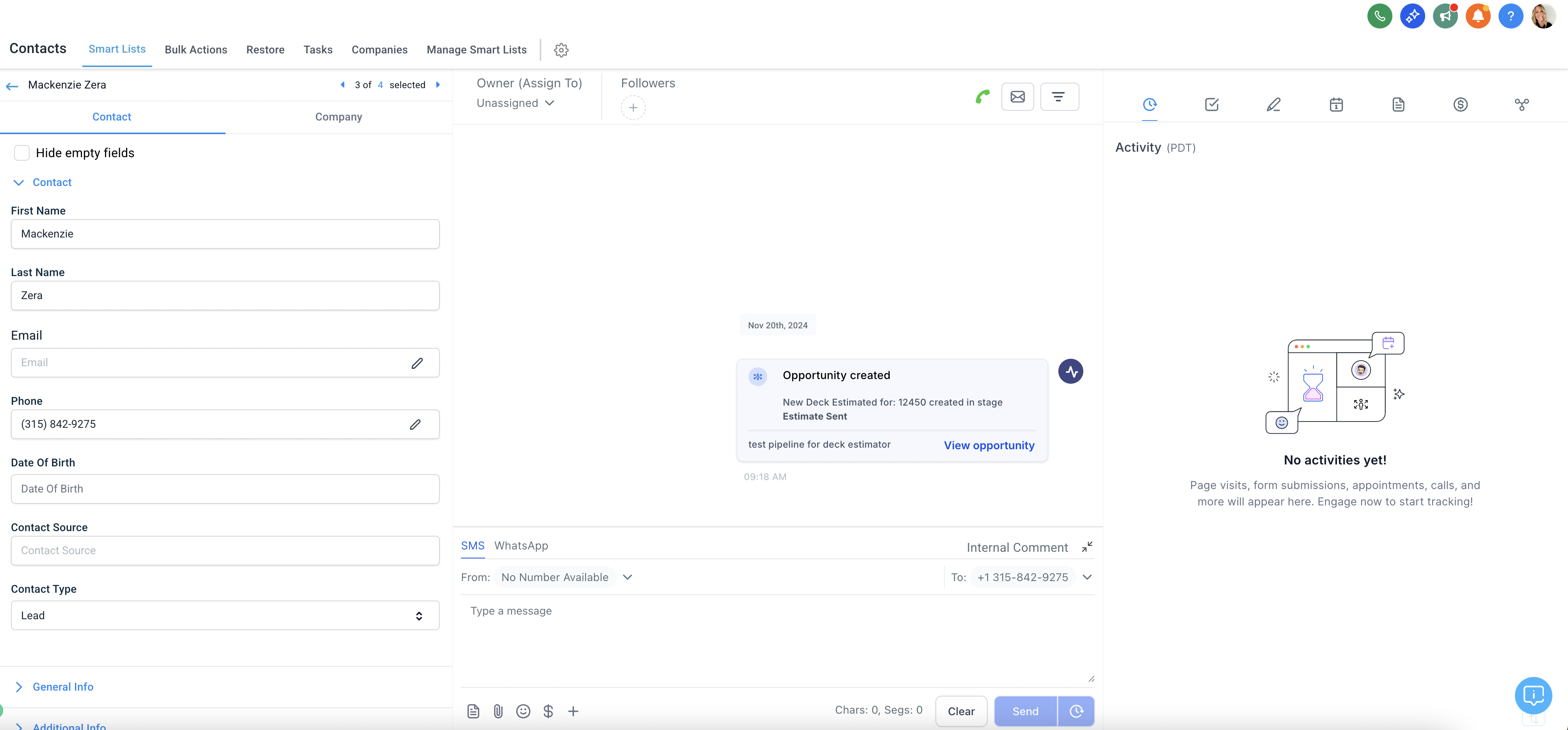 - Left Panel: Displays key details like form fills, their current stage in the Opportunities (Sales Pipeline), and any tags the workflows or you may have applied.