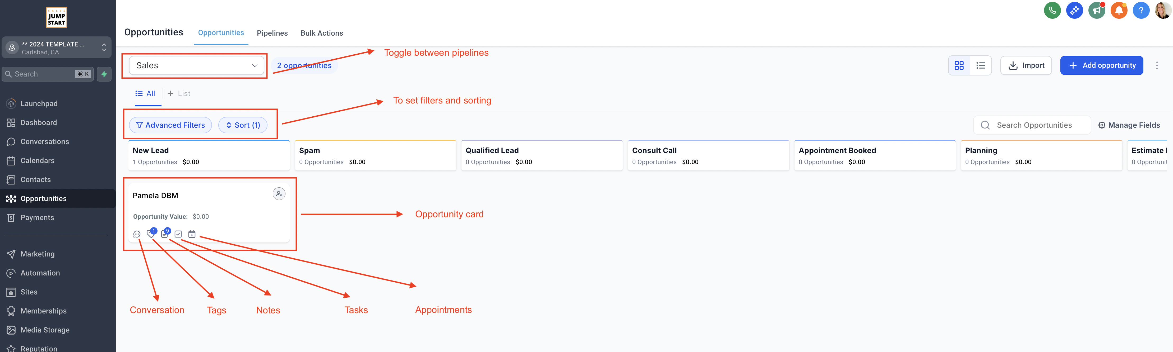 The Opportunities section is where you manage your leads as they move through your sales pipeline. It provides an organized view of every prospect’s journey, so you can stay on top of where they are in the process and what needs to be done next.